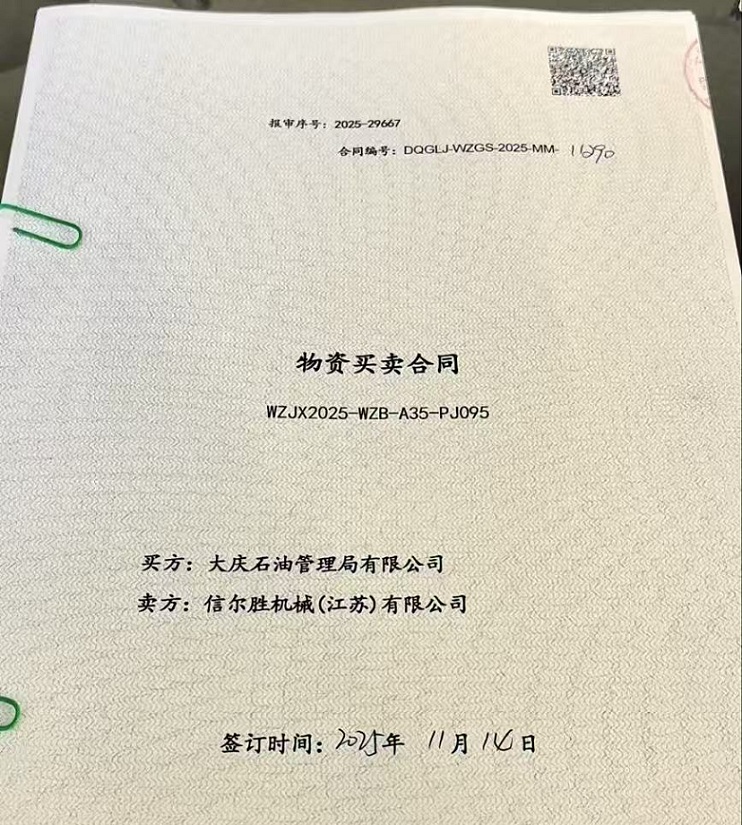 11月14日,信然集团下属生产工厂--信尔胜机械(江苏)有限公司与中国石油天然气集团下属企业--大庆石油管理局有限公司签订物资买卖合同(石油天然气压缩机及相关配件)。合同编号:DQGLJ-WZGS-2025-MM-11290,WZJX2025-WZB-A35-PJ095,报审序号:2025-29667