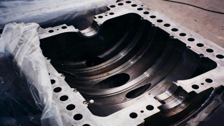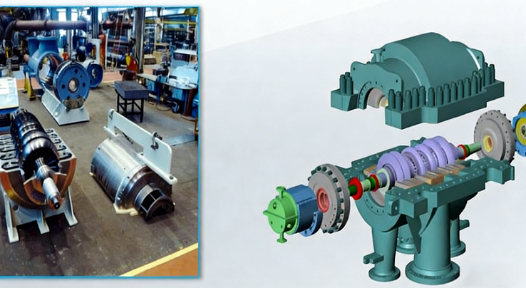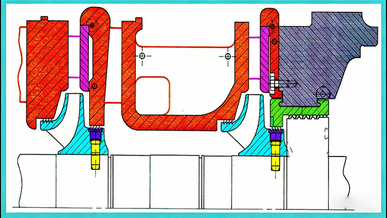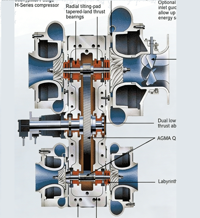 1、离心压缩机结构 1.1离心压缩机的分类 按结构型式分类,一般分为水平剖分型,垂直剖分型和多轴型3类。 (1)水平剖分型 此型压缩机由一水平中分面将气缸分为上下两半,在中分面处用螺栓连接。此种结构拆装方便,适用于中、低压力场合。 ![]() (2)垂直剖分型 垂直剖分型,由内外两层气缸,外气缸为一筒型,两端有端盖。内气缸垂直剖分,其组装好后再推入外气缸中。此种结构缸体刚度高、密封性好、刚性好,但安装困难、检修不便,适用于高压力或要求密封性好的场合。 ![]() (3)多轴型 齿轮箱中一个大齿轮驱动几个小齿轮,每个轴的一端或两端安装有叶轮。叶轮轴向进气,径向排气,以管道连接各级,从动轴转速不同,各级均在最佳状况下运行。适用于中低压空气、蒸汽等气体。 ![]() 型号 以某丙烯制冷压缩机为例: 3MCL404:加气、水平剖分、离心压缩机无叶扩压器,首级叶轮直径40cm,4个叶轮。 ![]() 第一单元:不填表示叶轮串级布置 填2表示两端压缩、叶轮背靠背布置 填3表示三段压缩或带中间抽气或加气 第二单元:B表示垂直剖分结构 M表示水平剖分结构 第三单元:CL表示离心压缩机及无叶扩压器 CO表示离心压缩机及首级单悬臂 第四单元:表示首级叶轮名义直径(单位:cm) 第五单元:表示缸内装的叶轮数目。 1.2离心压缩机主要零部件 离心式压缩机主要由转子、定子、轴承等部件组成。 转子是离心压缩机的主要部件,它是由主轴、叶轮、平衡盘等组成的。 一、叶轮 叶轮也称为工作轮,它是压缩机中最重要的一个部件。气体在叶轮叶片的作用下,跟着叶轮做高速的旋转。而气体由于受旋转离心力的作用以及在叶轮里的扩压流动,使气体通过叶轮后的压力得到了提高。此外,气体的速度能也同样在叶轮里得到了提高。因此可以认为叶轮是使气体提高能量的唯一途径。 叶轮是由轮盘、轮盖和叶片组成,这种叶轮称为闭式叶轮。 按照工艺方法的不同,叶轮又可以分为铆接叶轮,焊接叶轮,铣制焊接叶轮和整体铸造叶轮。 ![]() 二、主轴 主轴上安装所有的旋转零件,它的作用就是支持旋转零件及传递转矩。主轴的轴线也就确定了各旋转零件的几何轴线。 主轴通常为阶梯轴,以便于零件的安装。各阶梯的突肩起轴向定位作用。也可采用光轴,因为它具有形状简单,加工方便的特点。 ![]() 三、平衡盘 在多级离心压缩机中,由于每级叶轮吸入口两侧的气体作用力的大小不等,使转子受到一个指向低压端的合力,这个合力称为轴向力。轴向力对于压缩机的正常运转是不利的,它使转子向一端窜动。甚至使转子与机壳相碰,造成事故。因此要设法平衡(消除)它。 平衡盘就是利用它的两边气体压力差来平衡轴向力的零件。它位于高压端,它的一侧压力可以认为是末级叶轮轮盘侧的间隙中的气体压力(高压)。另一侧通向大气或进气管,它的压力是大气压或进气压力(低压)。由于平衡盘也是用热套法套在主轴上。上述两侧压力差就使转子受到一个与轴向力反向的力。其大小决定于平衡盘的受力面积。通常平衡鼓只平衡一部分轴向力。剩余的轴向力由止推盘(止推轴承)承受。平衡盘的外缘安装气封,可以减少气体泄漏。 ![]() 定子:固定不动的部件。主要包含气缸和其上的各种隔板等零部件,如扩压器、弯道、回流器、密封、吸气室和排气蜗壳等。 一、气缸 气缸也称为机壳,它通常是用铸铁或铸钢浇铸出来的。 对于高压离心压缩机,采用圆筒形锻钢机壳,以承受高压。 机壳一般由水平中分面,以便于装配、检修,上下机壳用定位销定位,用螺栓连接,下机壳装有导向柱,便于拆装定位。 吸气室、蜗壳也是机壳的一部分。 机壳内还装有隔板、密封体、轴承等零部件。 ![]() 二、隔板: 是离心式压缩机中形成固定元件的气流通道。 隔板类型:根据隔板在压缩机中安装的位置,可分为4种类型。位于每段第一级叶轮入口的称为进气隔板,位于每段最后一级叶轮出口的称为排气隔板,位于两段之间的称为段间隔板,位于每段中间形成扩压器、弯道和回流器的称为中间隔板。 隔板的作用:进气隔板与气缸一起形成进气室,将气体导流到第一级叶轮进口;排气隔板起末级扩压器和排气室的作用;段间隔板则是为了分隔两段的排气口或进气口;中间隔板作用一是形成扩压器,将从叶轮出来的气体的动能转变为压力能,二是形成弯道和回流器,使从扩压器出来的气体转弯并按一定方向进入下一级叶轮进行压缩。 隔板材料:离心式压缩机隔板大多采用加制铸铁或球墨铸铁材料,这是因为它们容易制造成隔板所需的复杂形状,并有较高的强度。而对于受力很大的段间隔板,就必须选用锻钢。 ![]() 三、扩压器: 作用:把气体的动能转化为气体的压力能。 一般由无叶扩压器、叶片扩压器等多种形式。 无叶扩压器: 无叶扩压器是由两个平行壁构成的环形通道组成,等宽度或变宽度。 无叶扩压器的结构简单,级变工况较好,稳定工况范围宽。 但是要增加扩压效果,必须要尽量加大直径,这就加大了机器的径向尺寸。而且摩擦损失较大,故设计工况下效率低于叶片扩压器。 叶片扩压器 在无叶扩压器的环形通道中,沿圆周装以均匀分布的叶片,就成为叶片扩压器。 叶片扩压器的优点:扩压程度大,尺寸小,设计工况下损失比无叶扩压器小,因为流道短,流动损失小(一般比无叶高3%~5%)。 叶片扩压器的缺点:叶片扩压器变工况时性能差,